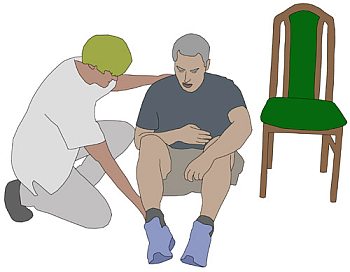 Pflegekraft stellt sich auf die Seite des aufgestellten Knies. Sie