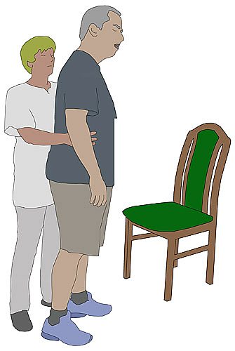 Pflegekraft unterstützt ihn dabei mit zwei Handkontakten unterhalb