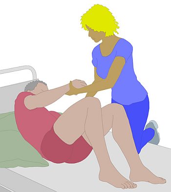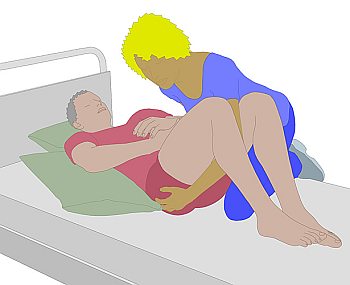ebenfalls zur Bettkante bewegt. Die Pflegekraft greift dafür mit einer