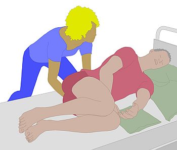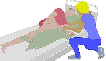 möglich an die Bettkante der weniger betroffenen Seite bewegt. Damit