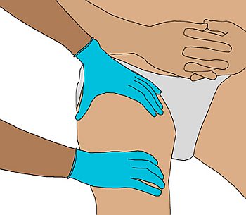 Pflegekraft umfasst mit beiden Händen den Oberschenkel und legt den