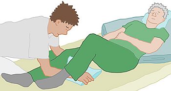 die Lagerung des Beines. Ggf. kann sie das Bein auf Höhe des Trochanters (Hals des Oberschenkelknochens) mit einem Handtuch