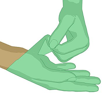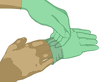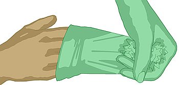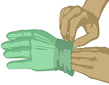 Die behandschuhte Hand zieht nun den Handschuh über die andere Hand.