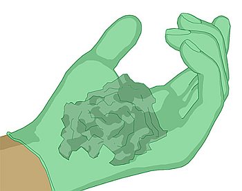Der Handschuh liegt nun zusammengeballt in der anderen noch behandschuhten Hand.