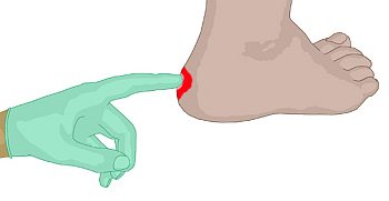 Die Pflegekraft drückt mit dem Finger auf die