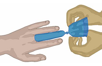Die verbleibenden zwei Drittel des Schlauchmulls werden über die zusammengeführten Daumen der Pflegekraft gerollt.