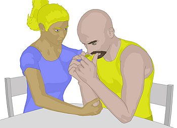 Der Klient sitzt aufrecht. Er stützt sich mit den Ellenbogen etwa auf einem Tisch ab.