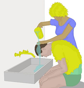Mit dem Schöpfgefäß werden die Haare ausgespült, beginnend mit dem Haaransatz, dann nach hinten fortsetzend.