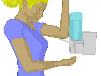 Hebel des Spenders. Mit der anderen "hohlen" Hand fängt sie das