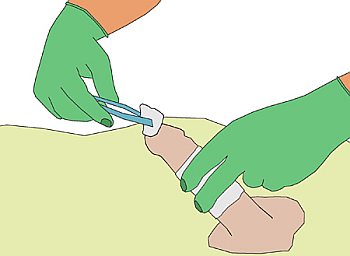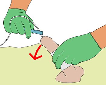die Katheterspitze, stülpt den Handschuh darüber und verwirft das
