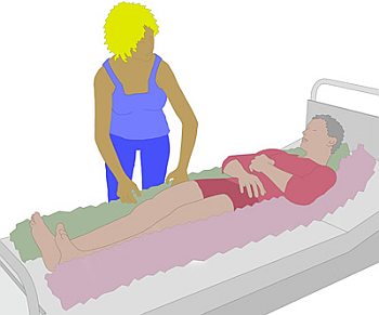 Pflegekraft legt zwei Deckenrollen rechts und links an die Seiten des