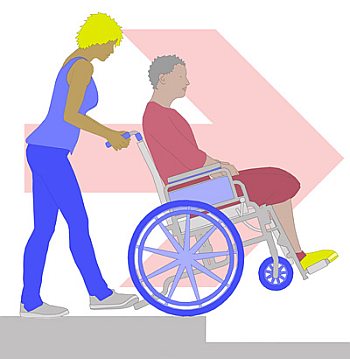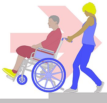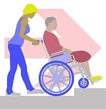 an die Stufe stoßen. Der Rollstuhl neigt sich etwas in Richtung der