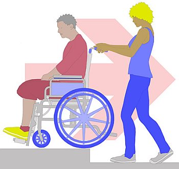 Pflegekraft kann den Rollstuhl über die Stufe nach oben ziehen. Sie