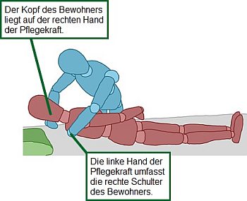 dazu nutzen, die linke Schulter der Pflegekraft zu umgreifen. Er kann