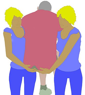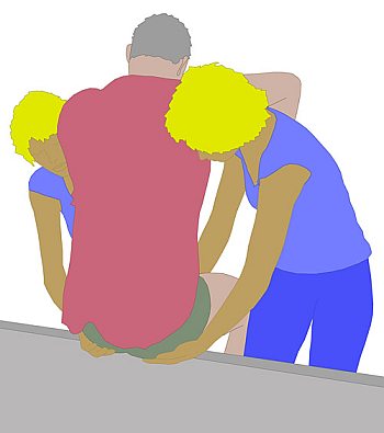 einer Hand umfassen beide Pflegekräfte je einen Oberschenkel des