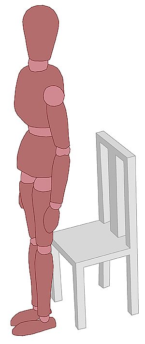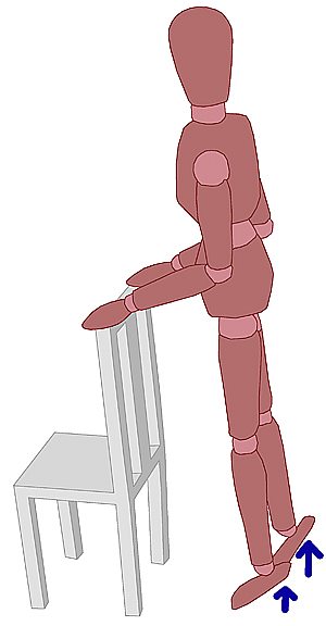 Hinter der Stuhllehne stehend, auf Zehenspitzen stellen und wieder zurück auf die Fersen: