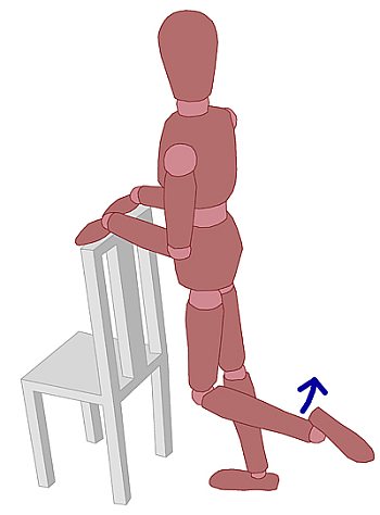 Hinter der Stuhllehne stehend, der Unterschenkel wird nach hinten oben gebeugt und wieder nach unten gestreckt: